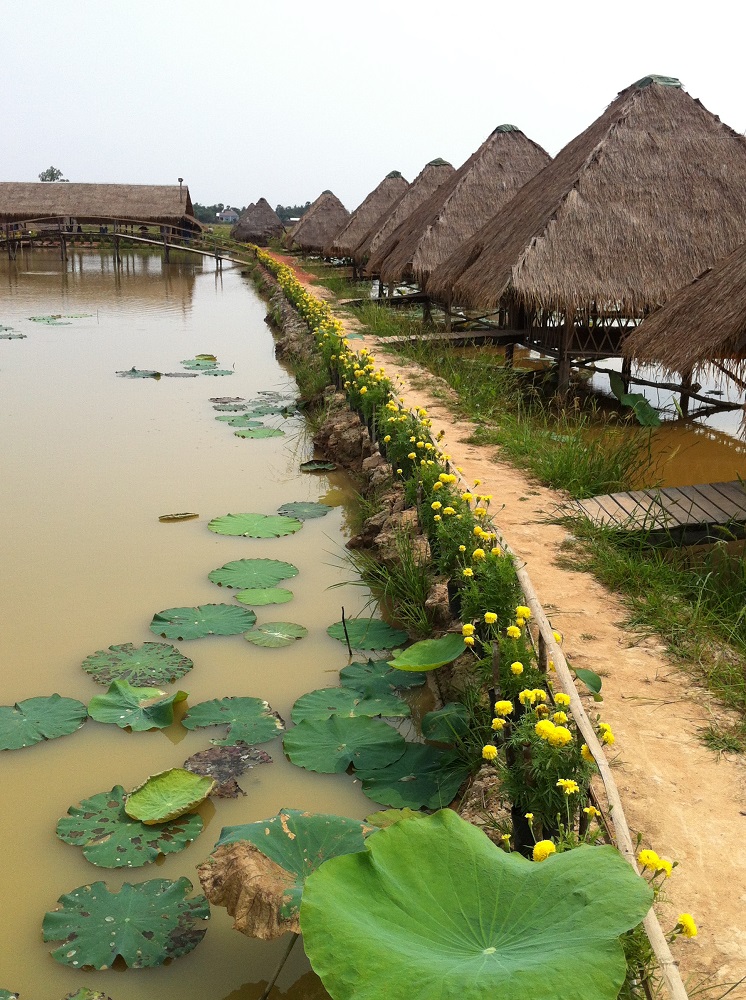 In the countryside the houses are much farther apart, with groupings together in small villages that you pass along the way. There are a lot of dusty dirt roads and walking trails heading off into the jungle all along the way. Fields of rice and lotus line the roads on both sides and the road is shared by scooters, cars, dump trucks and busses.