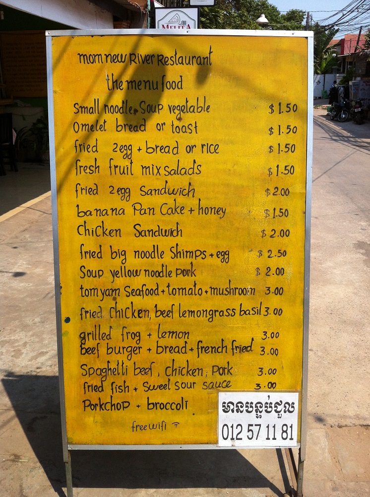 I can not speak very much as to the traditional foods of Cambodia other than to comment on the versions that I tried personally. First, I am a tourist, and so I am not privy to know about the secret hot spots that all of the local people eat at. Largely I spent my time in Siem Reap in the tourist areas and so the food was a mixture of local fare and mostly bastardized western dishes.